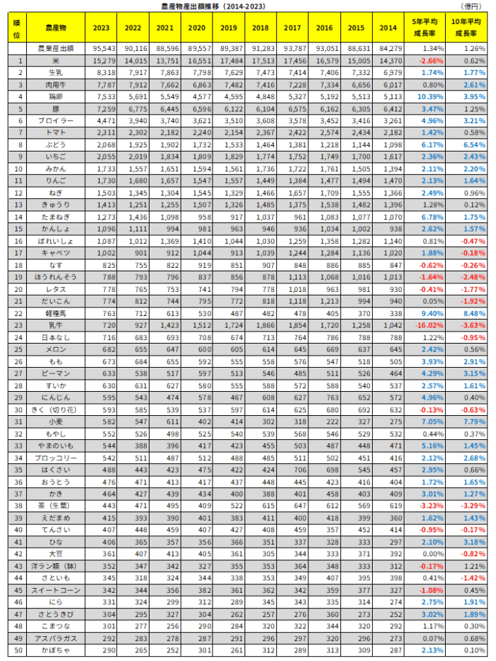 一方、米は2023年までの10年間は停滞しています。特に2023年までの5年間はマイナス成長です。ただし2024年の「令和の米騒動」を経て、現在は高値水準となっています。今後、米が産出額を押し上げるのか、それとも消費離れを加速させるのか。日本農業の最大の分岐点な気がします。